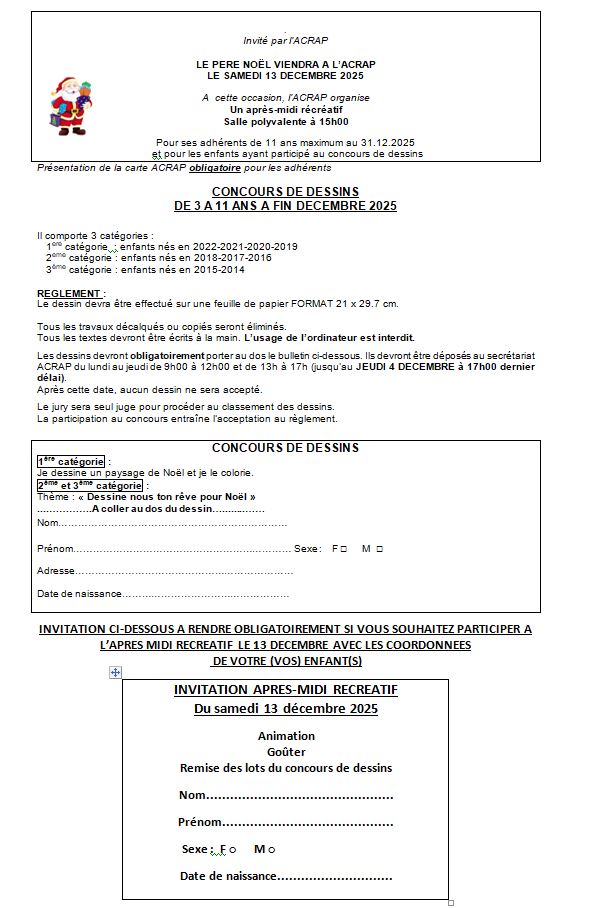 Pour Noël, l’ACRAP organise un concours de dessins. Le père noël sera présent le 13 décembre pour remettre les récompenses. N’oubliez-pas de participer et de déposer les dessins rapidement.